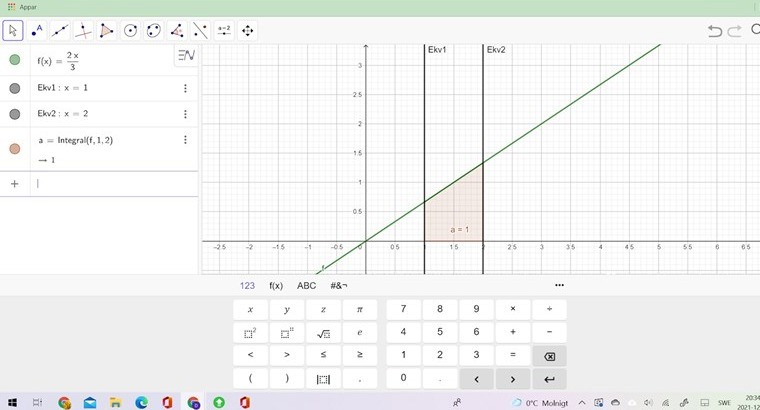 Rita upp funktionen f(x) = 2x/3. Sätt ut integrationsgränserna x = 1 och x = 2. Markera arean som besränsas av f(x), x = 1, x = 2 och y = 0.