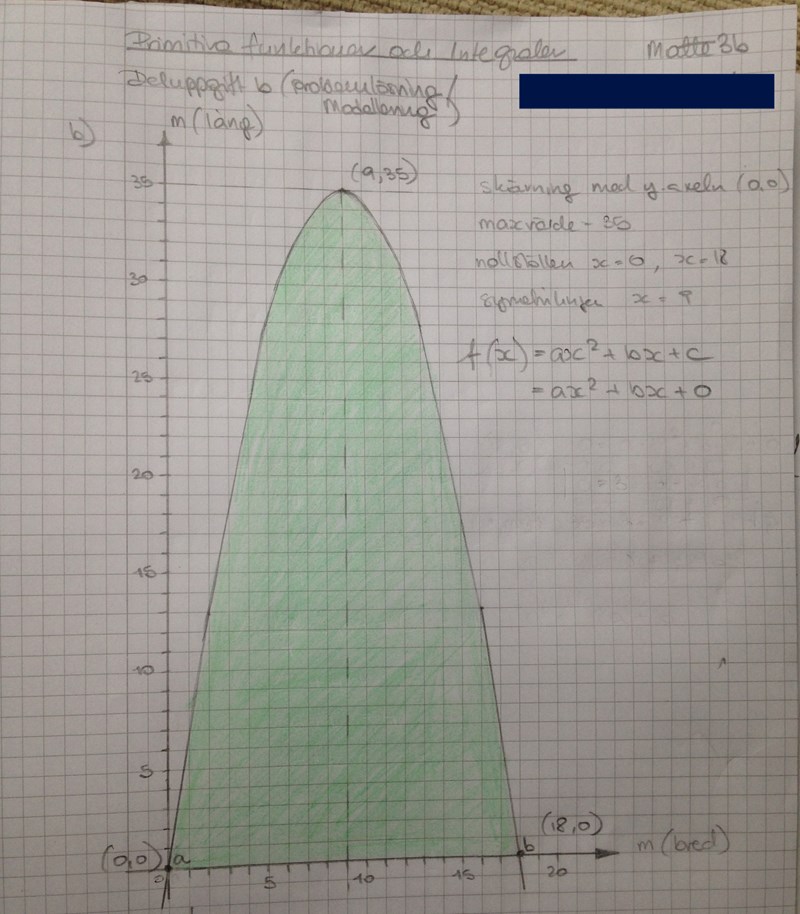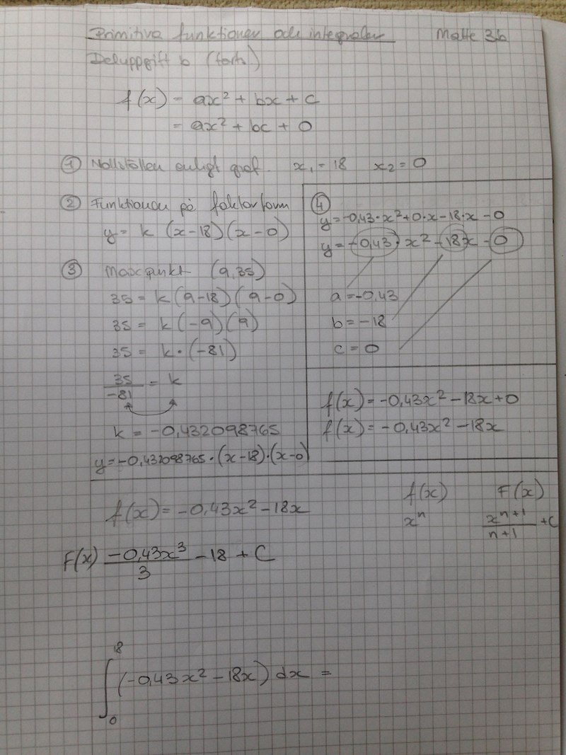 Bonadea skrev :T1997 skrev :Tycker du ser ut att vara på god väg till att finna lösningen. För att beräkna arean under kurvan bör du beräkna den primitiva funktionen, var uppmärksam på din bx-term, ser ut som att du har deriverat den istället. Därefter bara att beräkna F(18)-F(0) för att finna arean.