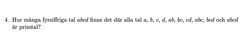 baharsafari skrev:Laguna skrev:Gå lite mer systematiskt fram. Du vet vilka tal som a, b, c och d kan vara. Ta reda på vilka tvåsiffriga primtal du kan bilda av de siffrorna.