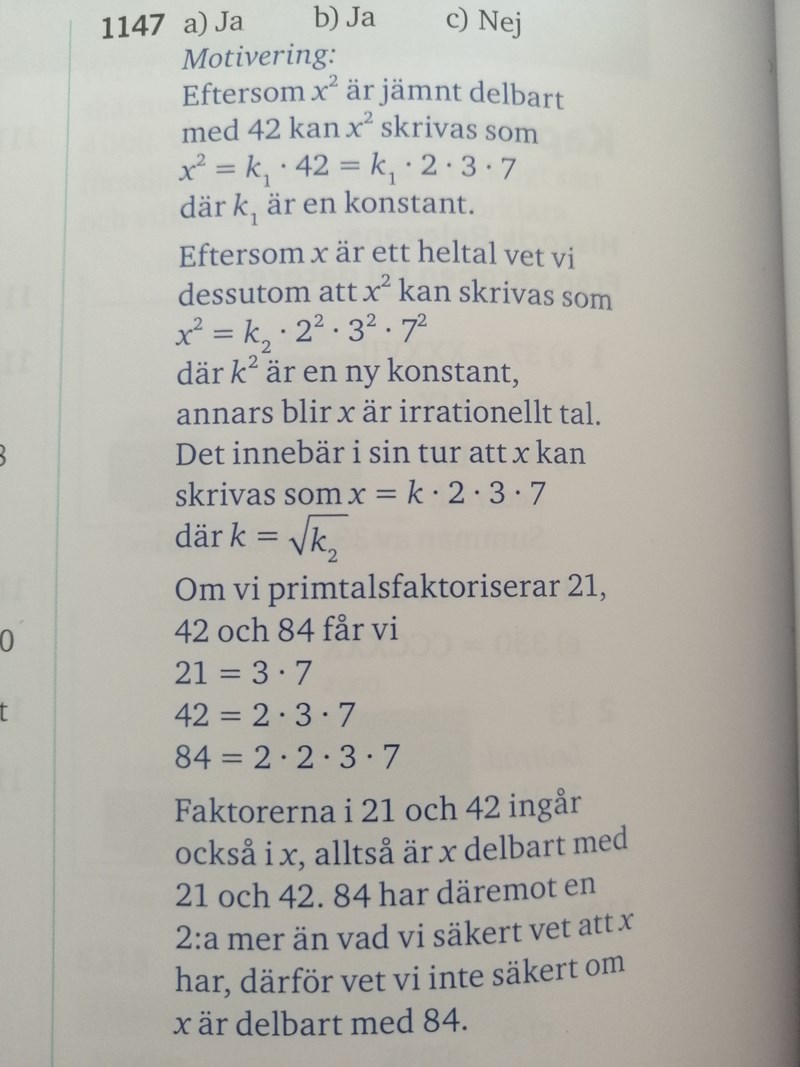 "Talet x är ett heltal och x2 är jämnt delbart med 42. Kan du säkert säga att x är delbart med 21, 42, 48?"