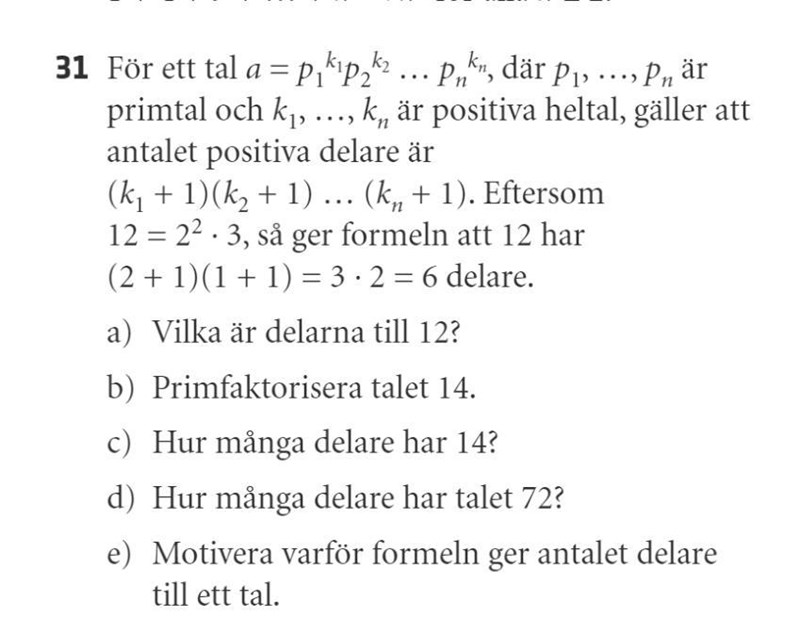12 har 6 delare eftersom 12 kan skrivas som 2^2*3^1 och enligt formeln får vi :