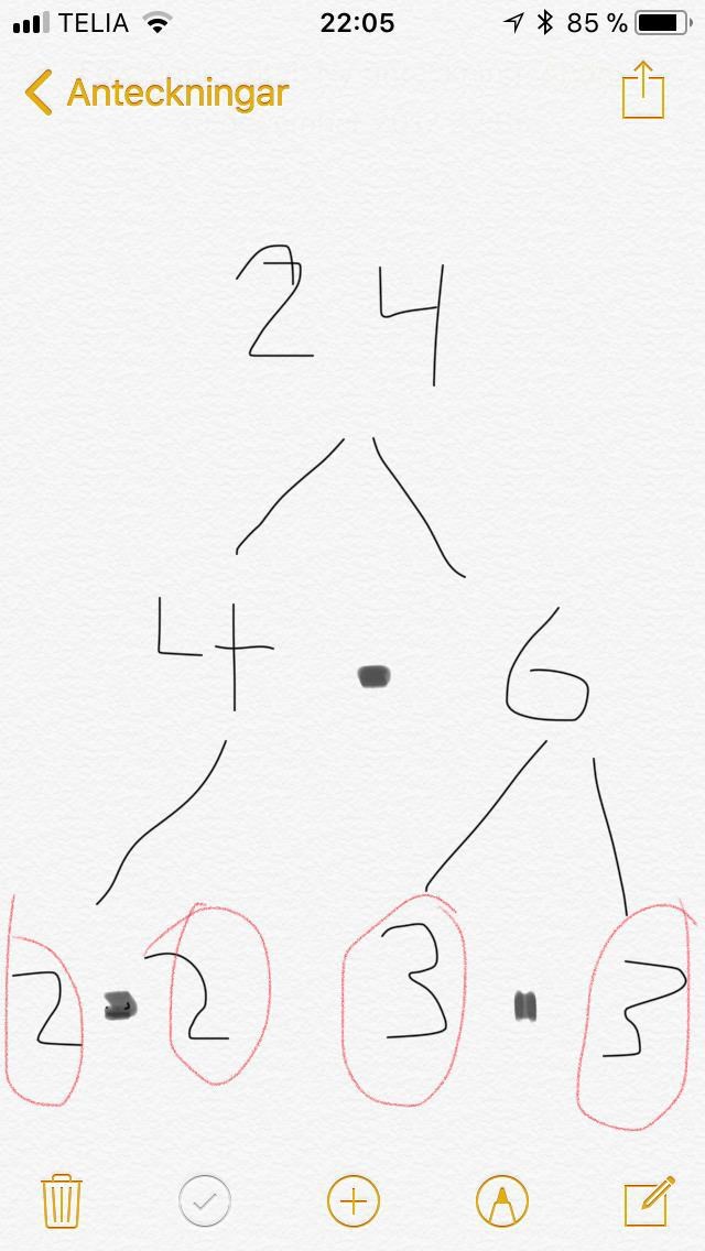 De jag har ringat in är primtal och talets 24 primtalsfaktorer. Man kan dela in tal på olika sätt så samma tal kan få olika primtalsfaktorer
