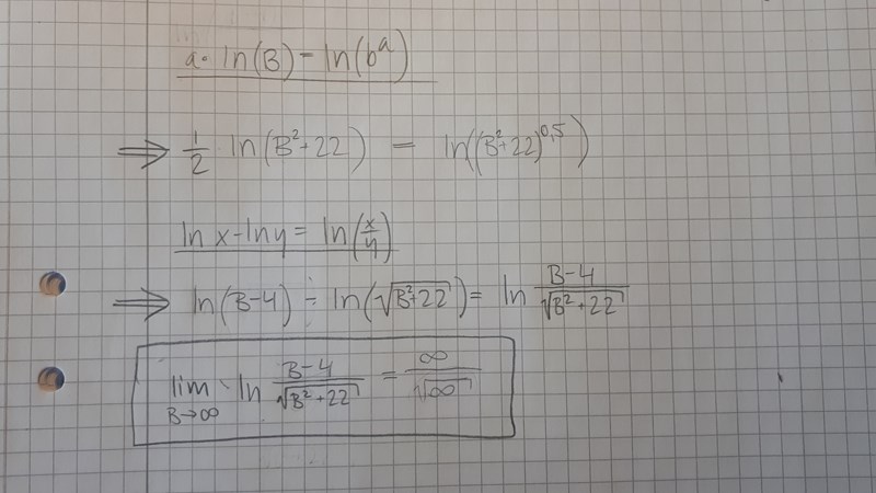 ln(x) - ln(y) = ln(x/y) innan du sätter låter B gå mot oändligheten
