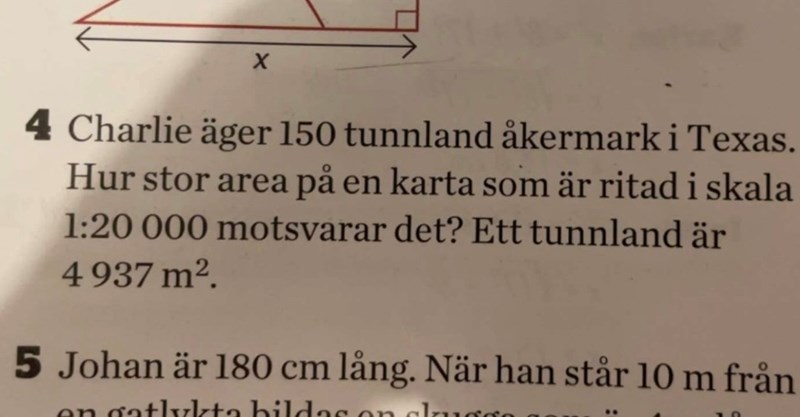 jag tog först 150 x 4937 = 740550 m2.    Sedan ska man ju ta verklighet / areaskalan så 740550/400000000. Svaret blir 0,001851375 som du sedan multiplicerar med 10 000 för att få i cm2
