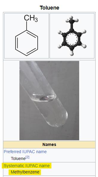 På engelska Wikipedia kan du ofta se vilket som är det systematiska namnet på en molekyl. För att veta vad du ska söka på kan du börja med att googla den kemiska formeln, i detta fall C6H5CH3, då brukar Wikipedia komma upp som en av de första träffarna (för mig åtminstone).