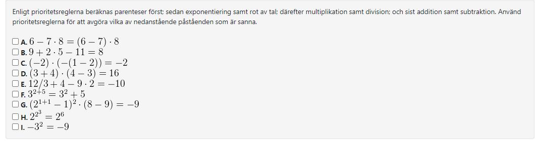 Jag svarade följande "B, C, E, G, H och I" och jag missar något vet inte om det är någon som är ikryssad eller inte....
