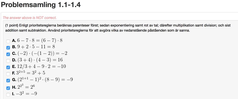 H) 28 = 26 ??? Även om jag anger att detta är inkorrekt då blir mitt svar fel. :-(