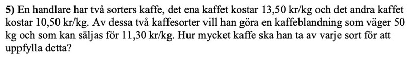 Vet du hur man ställer upp ett ekvationssystem? Kan du i så fall skriva en ekvation som beskriver att summan av mängden kaffe ska bli 50 kg, samt en ekvation som beskriver att det totala priset ska bli 11,30*50 kr? Du kan kalla mängden dyrt kaffe för x och mängden billigt kaffe för y.