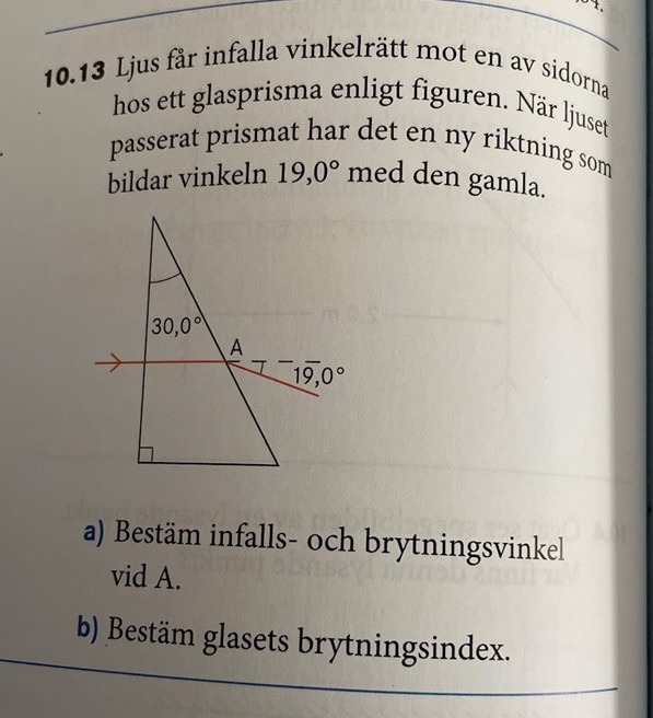 Jag har läst i boken, men inte riktigt förstått deras förklaring. Jag tänkte först att brytningsvinkeln skulle vara 19 grader, men detta är fel.