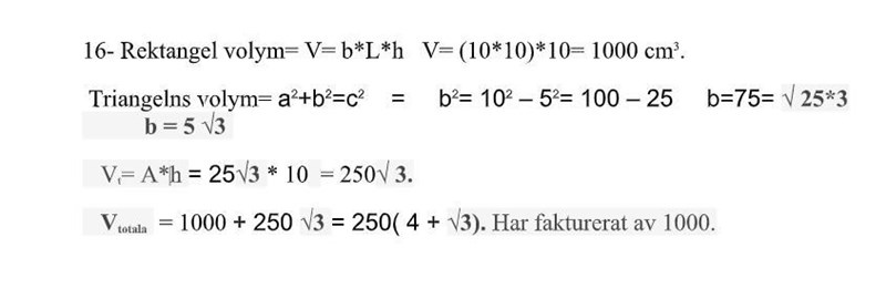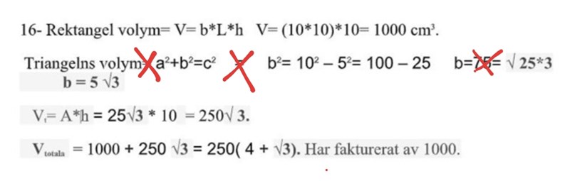 Det skulle kunna bero på att du använder vissa ord fel - en triangel och en rektangel är tvådimensionella objekt, de har ingen volym. Om du menar "kubens volym" och "det triangulära prismats volym" borde du skriva det. Och "Triangelns volym=a2+b2=c2 = b2=102-52=100-25 b=75=..." är praktiskt taget obegripligt, du borde ha skrivit något typ "Höjden i den rätvinkliga triangeln är... Pythagoras sats ger..." Det ät inte triangelns volym som är .