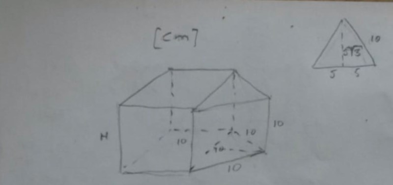 Jag har bara fått den här frågan, "Tänk dig ett prisma bestående av en rektangel och en triangel, som basytor. Hur stor volym har prismat om alla sidor är 10 cm?", sedan jag har ritat den ovanstående bild och uträknat enligt min kunskap och volym reglerrna för olika figurer... min lärare accepterade inte svaret men har inte skrivit varför.