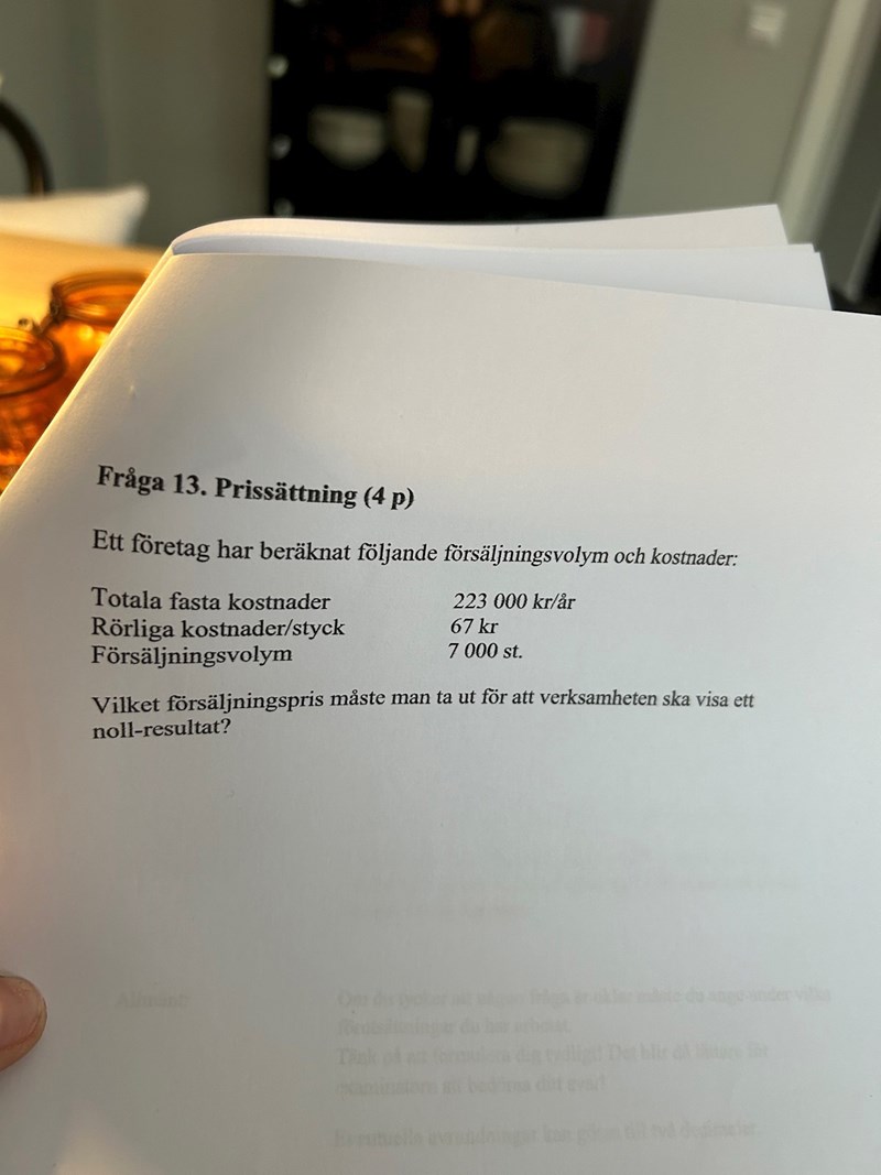 klonk skrev:Om vi antar att företaget endast säljer denna enstaka produkt så ger de fasta kostnaderna delade med volymen, dvs 223000/7000, ett sorts styckpris för att gå netto-noll (per produkt). Sedan adderar du 67kr.