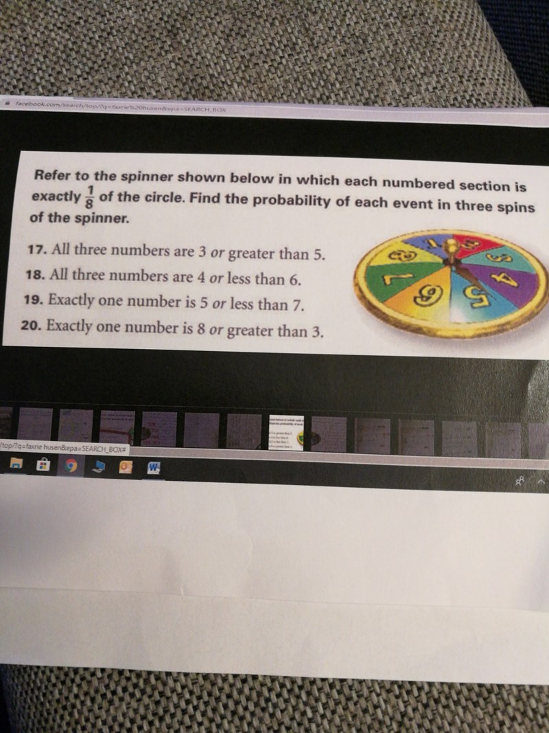 Sannolikheten att på en snurr hamna antingen på 3 eller på mer än 5 är alltså 4/8, och eftersom "snurrningarna" är oberoende så hittar vi sannolikheten att detta händer tre gånger på rad genom att multiplicera: (4/8)(4/8)(4/8) = (4/8)^3 = 0,125 eller 12,5%.