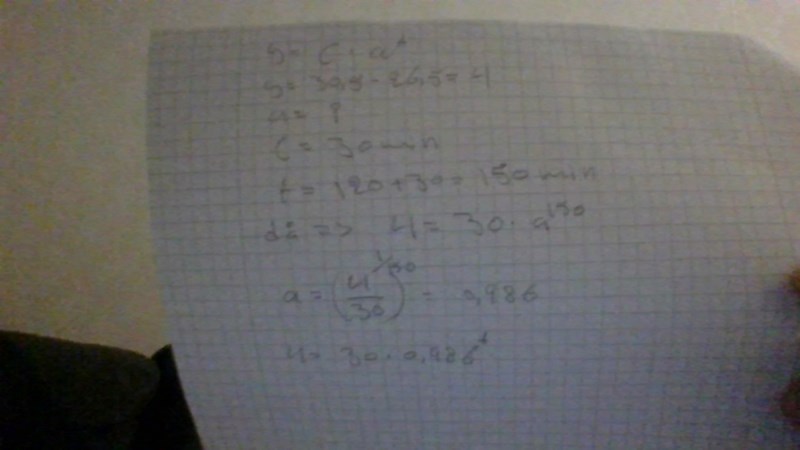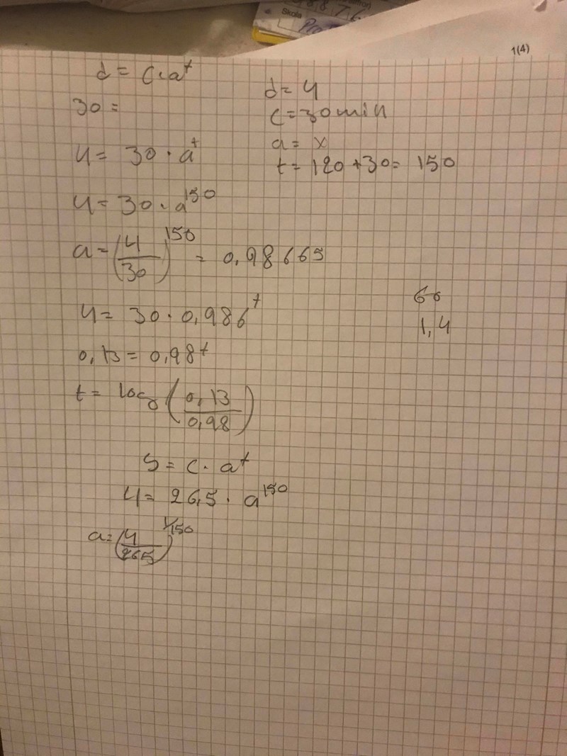Antag att mannen mördades vid en okänd tid. Vid tiden av hans död så har hans kropp temperaturen 37 grader. detta ger oss villkor på C, . Nu vet vi att vår exponentialfunktion är på form . ytterligare vet vi att klockan 8.00 är rättsläkare på plats och att hans temperatur då ligger på 30.5 grader, 6h senare ligger den på 26.5 grader.