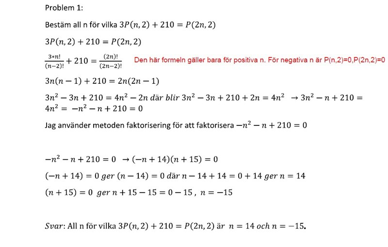 problem 1 av Bestäm all n för vilka 3P(n,2)+210=P(2n,2)