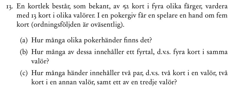 b) Svaret är 13·4813 \cdot 48  jag köper att det är 13 familjer, men visst måste vi välja detta karrén bland 52 kort? sista 48 är jag med.