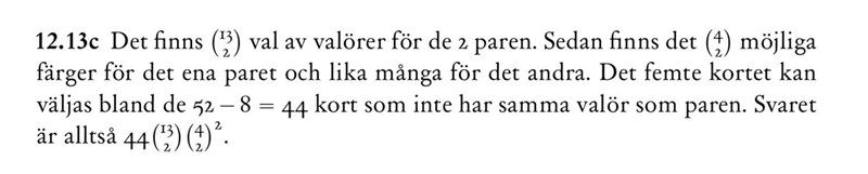 Förklaringen är följande: Vi ska välja två par, av tretton olika sorter. För varje par kan vi välja 42 möjliga uppsättningar av två kort. Efter det kvarstår 44 möjliga val av det sista kortet, därav facits svar.