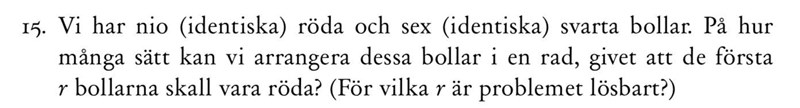 För r = 7 får vi två bollar som inte ligger längst fram, dvs. hur kan vi ordna en kö av sex svarta bollar och två röda? Det blir .