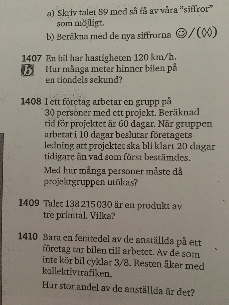 Räkna antalet persondagar! En persondag är den mängd arbete en person hinner med på en dag. Om det tar trettio personer sextio dagar att bli klara med ett projekt, är projektets storlek 30·60=180030\cdot60=1800 persondagar. Hur många persondagar har de hunnit med efter tio dagar? Hur många persondagar är kvar? Hur många dagar ska de hinna göra detta arbete på?