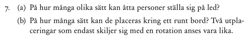 Fråga b) enligt faciten, det är . Man sätter den första person och de andra sätter sig i följden kring bordet. Men detta ''svans'' borde nog gå åt vänster och åt höger?