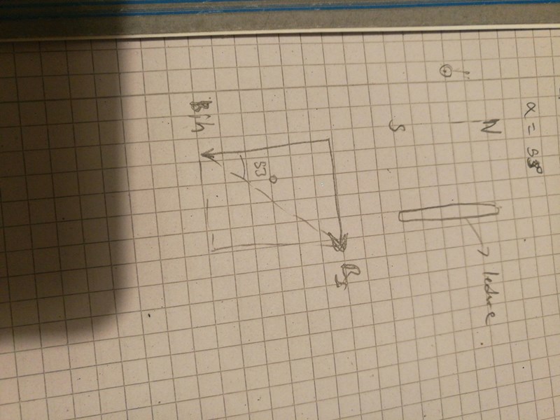 Ja bjh ska peka mot norr dvs åt uppåt eller? Och då går strömmen uppåt som vi kallar för norr. Magnetfältet pekar då åt höger isåfall. Något som förvirrar mig är att bjh pekar åt höger när vi får given storleken av jordmagnetiska fältet samt inklinationen vinkel och då definieras norr åt den riktningen som bjh pekar. Kompassen pekar också åt norr om inget ström kommer in i vägen. Men sen när frågorna är såhär strömmen är det där värdet och bjh på plats är det värdet. Då blir jag ännu förvirrad av vad man menar på plats