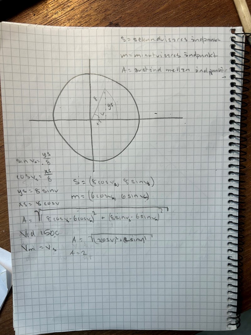 Med hjälp av avståndsformeln och att sekundvisaren har koordinaterna (8cos(v), 8sin(v)) där v är vinkeln från x-axeln, får vi efter förenkling