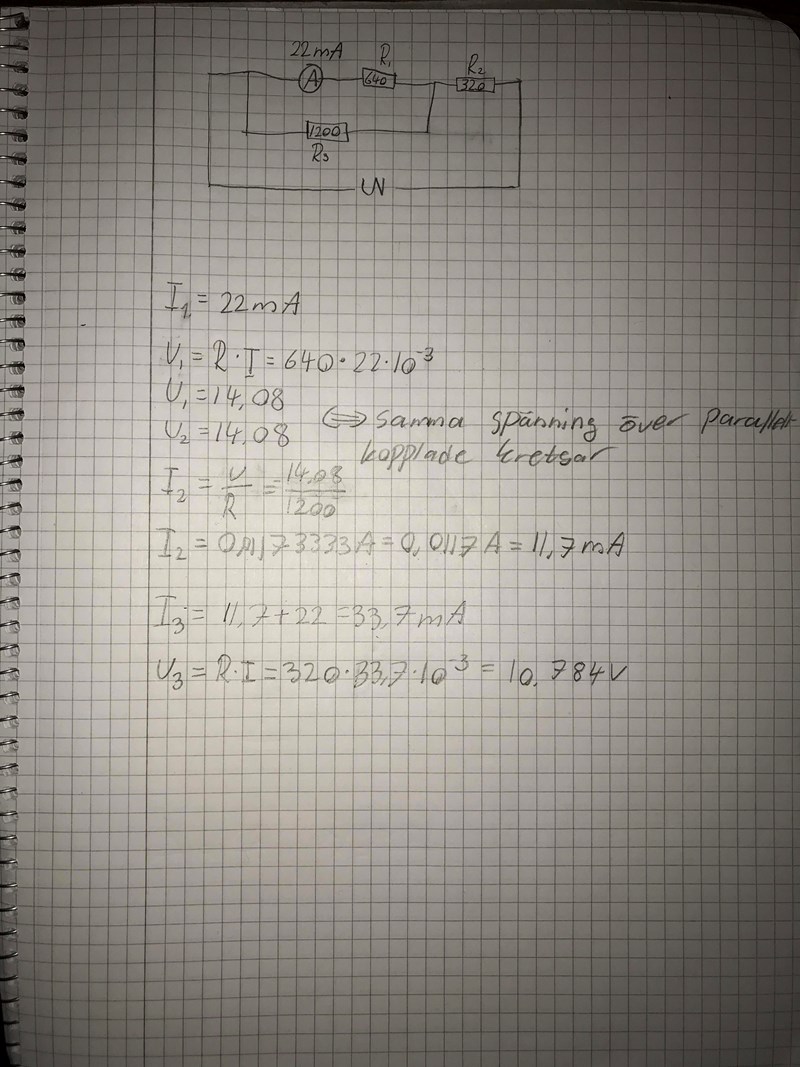 Behöver hjälp med denna uppgift. Kretsen på bilden är den i fråga. Man ska bestämma ström och spänning över samtliga motstånd i kretsen och amperemetern i kretsen visar 22 mA. Det finns inget facit på uppgiften och min lösning känns som om jag kommit fel. Jag har kommit fram till att spänningen är lägre över R2 än i de andra motstånden. Är detta rimligt ?