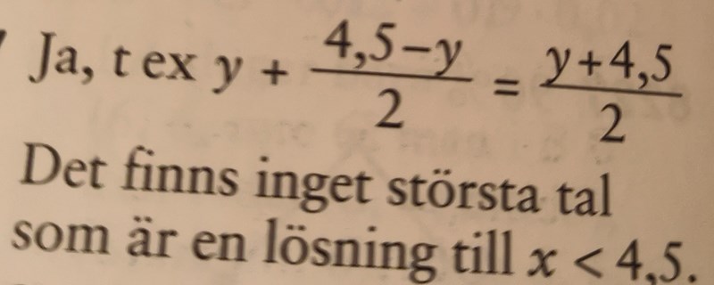Om man tar medelvärdet mellan 4,5 och Alfreds tal (som kallas y) så är det alltid större än det tal som Alfred sa, alltså finns det inget största tal som är mindre än 4,5. Är den formuleringen av det som står i facit enklare?