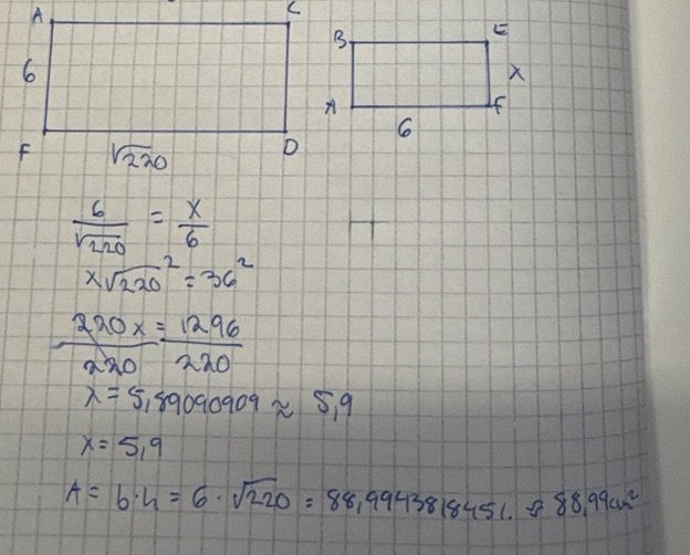 Förstår du vad som händer? Man dividerar motsvarande sidor med varandra, dvs långsidan på den stora rektangeln men långsidan på den lilla rektangeln och likaså med kortsidorna. Sedan utför man korsmultiplikation och löser resten som en vanlig ekvation.