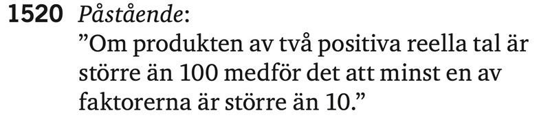 men i och med att jag vet att xy>100 där x >10 måste y 10. jag drar ju den slutsatsen för att jag vet att min produkt är större än 100. Jag vet med säkerhet att y INTE är 10 då det skulle ge mig en produkt som är mindre än 100.
