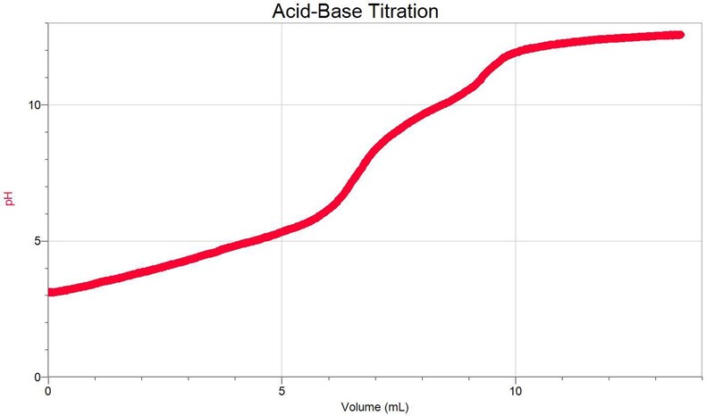 Detta är kurvan jag har lyckats plotta. Jag använde en pH-mätare och en droppräknare för att beräkna pH respektive volymen tillsatt NaOH.
