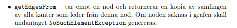 // Hämtar edges som utgår ifrån en given node. @Override public Collection<Edge<T>> getEdgesFrom(T node) { if(!places.containsKey(node)) { // Noden finns inte så vi kastar exception. throw new NoSuchElementException(); } // Set för att hålla de edges vi samlar på oss. // Vi kan hoppas att Edge<T> implementerar equals och hashCode korrekt, // annars fungerar kanske det inte fungerar som tänkt. Set<Edge<T>> edges = new HashSet<>(); // Hämta alla routes som utgår ifrån den givna noden. Set<Route> fromPlaces = places.get(node); // Loopa över routes ... for(Edge<T> route : fromPlaces){ // Om routens *DESTINATION* är den givna noden, så lägg den till samlingen. // Skulle vi inte hämta den som går *FRÅN* den givna noden? // Det känns som om vi hämtar noder som går till sig själva? if(route.getDestination().equals(node)){ edges.add(route); } } return edges; }