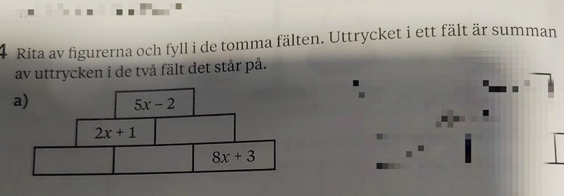 Alltså 5x - 2 = 2x + 1 + ruta3.