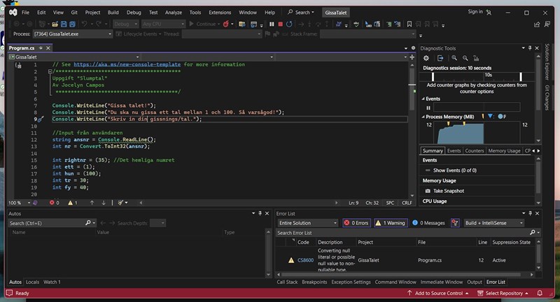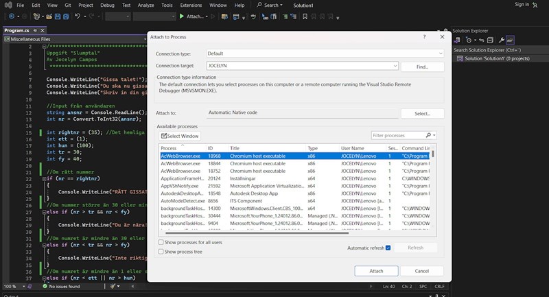 Här nedan är det där jag har problem. Efter att jag sparat min fungerande kod så öppnar jag filen och trycker kör och denna ruta kommer upp. Trycker på attach längst ner till höger och korden börjar sedan köras.