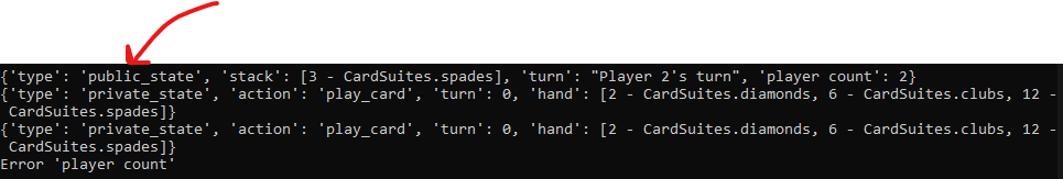 Alla meddelanden skickas som serialiserade dictionaries. Så det är dictet som motsvarar "public_state" som broadcastas från servern jag ville printa med mina tre print-statements print(public_state). Som du ser modifierar jag inte mitt public_state någonstans, men trots detta blir utskrifterna inte samma alla tre gånger (första utskriften blir rätt, resterande två blir ett helt annat meddelande). Så min variabel public_state skrivs över på något sätt?