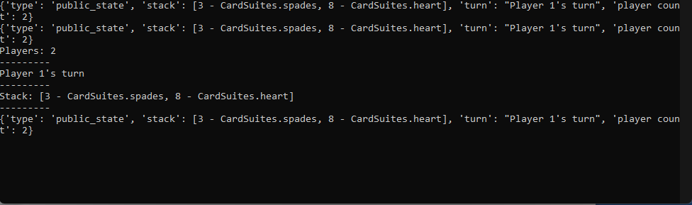 Jag håller på med ett projekt i nätverksprogrammering och jag ville testa att göra en liten "rough" version av spelet skitgubbe som man ska kunna spela i konsolen. Problemet är att det blir något knas när klienten, vars tur det blir efter att första spelaren gjort sitt drag, inte får rätt information. I början av varje "turn" broadcastas "public_state" out till alla klienter, som innehåller information om vems tur det är, hur många spelare som är anslutna och så vidare. Sedan skickas en instruktion ut till den spelare vars tur det är. Det kan vara något i stil med "play_card" eller "take_stack" beroende på vilka möjligheter servern har bestämt att spelaren har.
