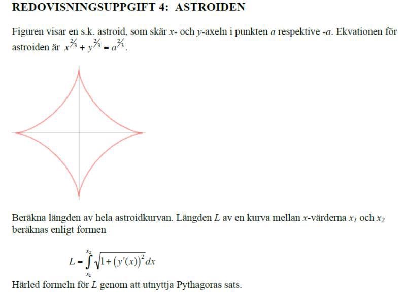 Hej! Jag har problem med att räkna ut båglängden för denna uppgift. Jag satte ekvationen till y=(a^2/3-x^2/3)^3/2. Sen vet jag inte riktigt hur jag skall gå till väga för att få ut L. Jag antar att jag skall sätta gränsvärderna för L till a samt 0 och multiplicera med 4 för att få längden på hela kurven men är osäker. Går integralen ens att beräkna med partiell eller måste jag ta numeriskt?