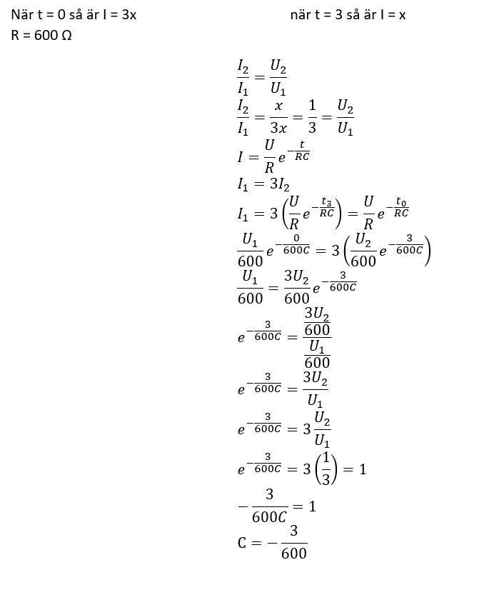 "En plattkondensator laddas ur genom en resistor på 600 Ω. Strömmen i kretsen är efter 3s en tredjedel av vad den var precis då urladdningen började. Beräkna kondensatorns kapacitans."