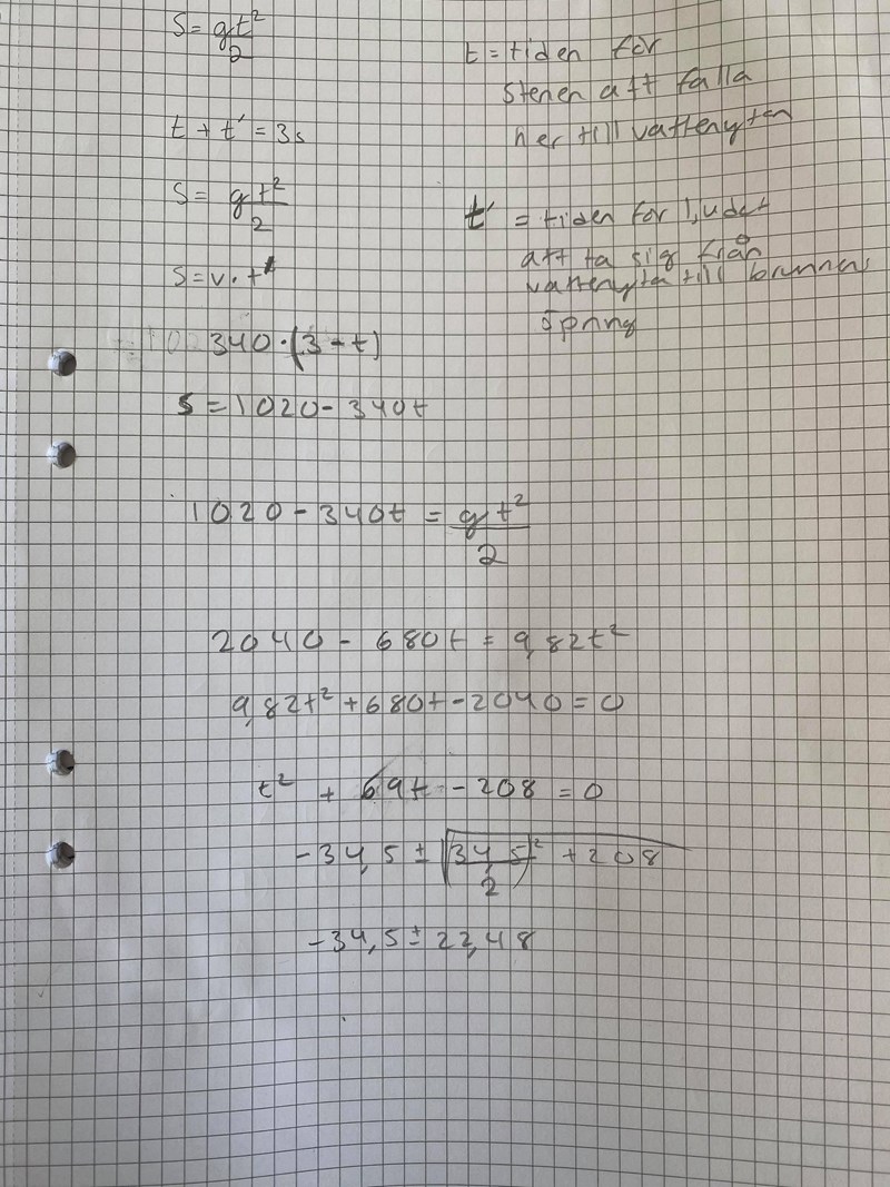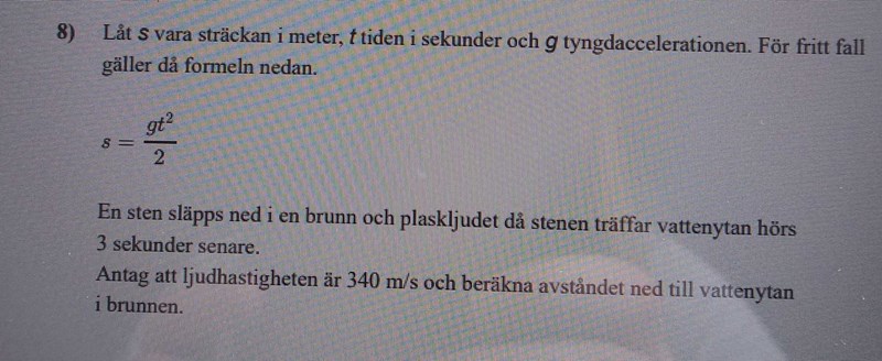 Det tar en viss tid t för stenen att falla ner till vattenytan. Sedan tar det en viss tid t’ för ljudet att ta sig från vattenytan till brunnens öppning. Tillsammans skall dessa tider bli 3 sekunder. Dvs