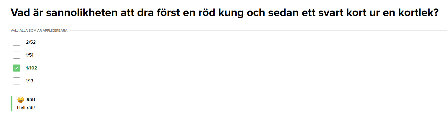 - P(svart kort)=26/51 (samtliga klöver/spader)