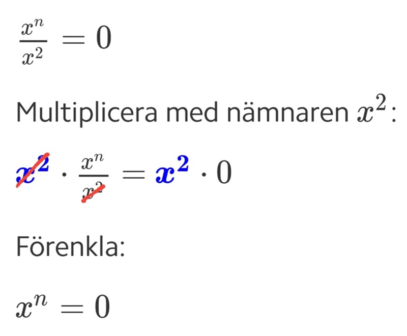 2. På rad 3 har du fått tillbaka rätt exponent i nämnaren, men när jag i mitt förslag skrev att du ska multiplicera med så upphöjer du istället vänsterledet till och högerledet upphöjer du istället, först till x och sedan till (n-2), vilket är samma sak som att upphöja högerledet till . Jag har markerat detta i magenta på rad 3.