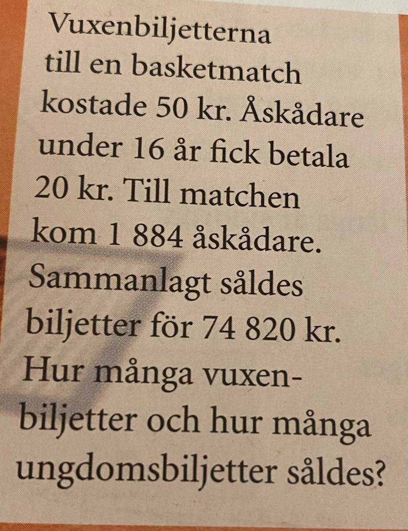 och 20 (1884-x) = det totala antalet-antalet vuxna som = antalet biljetter under 16