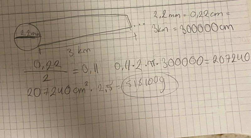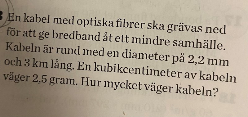 EnApelsin skrev:I frågan står det att du ska räkna ut vikten och för det behöver du volym och densitet (densiteten har du redan fått i frågan). Mantelarean är ytan av utsidan på kabeln, dvs om t ex skulle rulla in den i ett lager plast vet du hur stor yta plast du behöver.