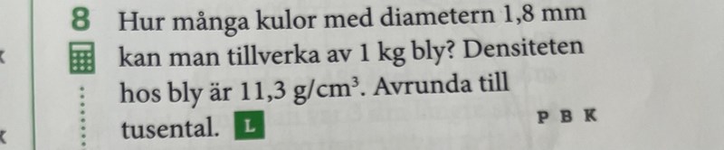Du vet hur mycket 1 cm3 bly väger, så det vore bra om du visste hur många cm3 en blykula upptar.