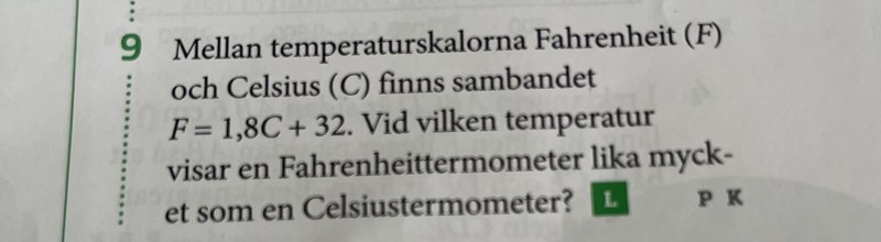 De vill att du klurar ut när temperaturen mätt i Fahrenheit, dvs F, är lika stor som temperaturen mätt i Celsius, dvs C.
