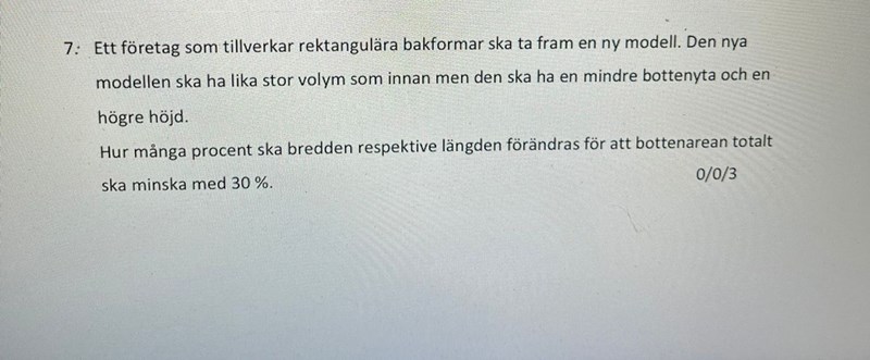 Måste både bredden och längden förändras? Om det enda kravet är att volymen ska förbli densamma men bottenytan ska vara minska med 30 % finns det flera lösningar. Om antingen bredden eller längden minskar med 30 % minskar hela bottenarean med 30 %, båda behöver inte ändra på sig. Om uttrycket för volymen är , skulle uttrycket för bottenarean vara . Om vi säger att bredden minskar med 30 % minskar hela bottenarean också med 30 %.