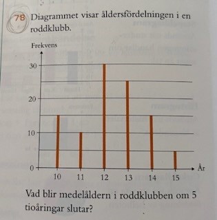 När det gäller medelvärden, så behöver du dividera med antalet. Nu har du räknat ut hur många personer det i snitt finns i varje ålderskategori, men det du vill beräkna är snittåldern på personerna. Tänk såhär: Hur många år bidrar de medlemmar som är femton med? Om det är en femtonåring, bidrar hen med 15 år till medelvärdet. Om det är två femtonåringar, bidrar de med 30 år till medelvärdet (15·215\cdot2). Hur många år bidrar klubbens femtonåringar med tillsammans? :)