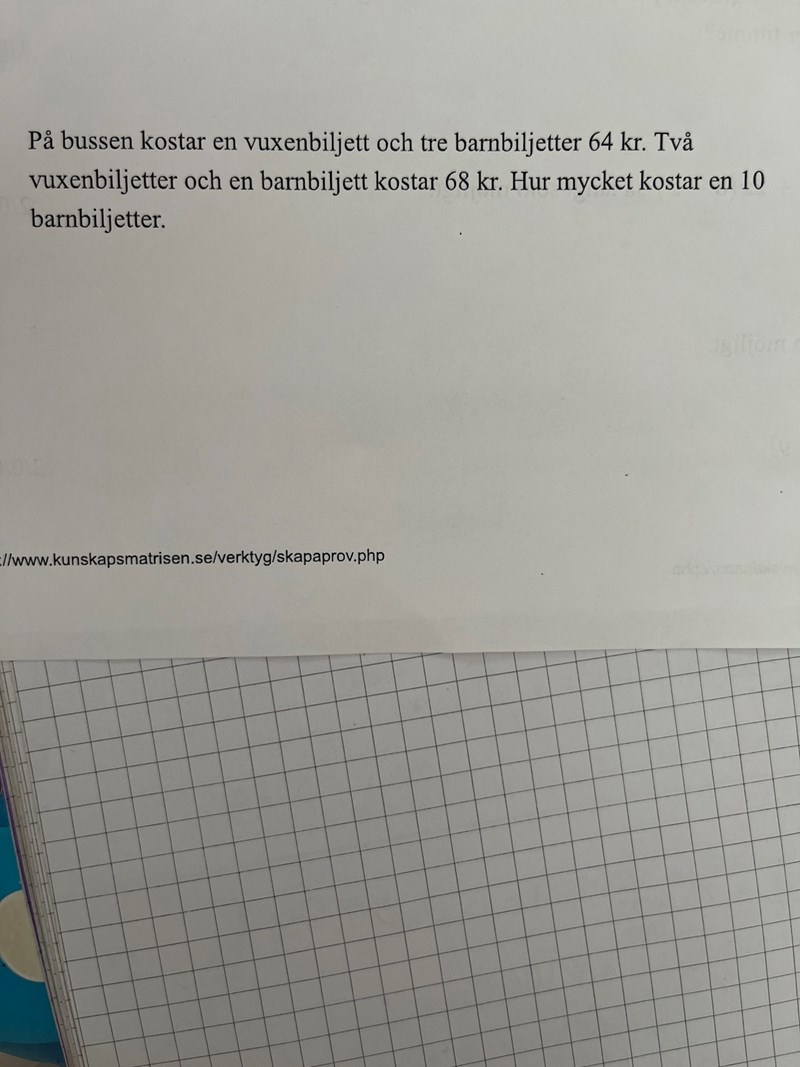 Antag att en vuxenbiljett kostar  x  kr och en barnbiljett  y kr.