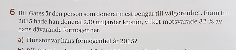 Det blir inte riktigt rätt i början. 230 miljarder kronor är summan han donerat, vilket motsvarar 32%, alltså 0,32 i decimalform. Metoden du använder är korrekt, du har bara snurrat till procentsiffrorna lite. Gör samma sak, men använd 32% istället för 68%, så blir det rätt!