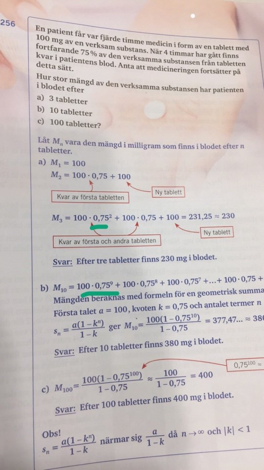 Hej! Här finns det et uppgift som svaret finns redan i boken, men jag hänger inte med några steg i lösningen. Jag har markerat de. varför tar dem 0,75 upphöjd till 2 ? Är det för att när man tar andra medicinen så finns det 0,75* 100 mg av den första medicinen och när man tar den tredje medicine, så finns det 100* 0,752 mg av den första medicinen?